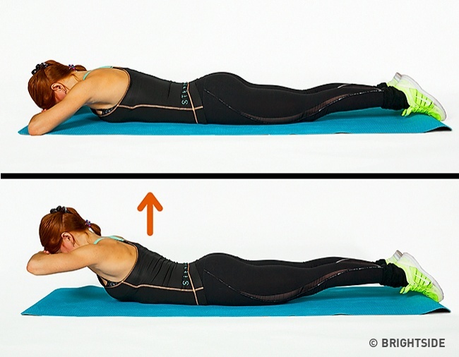 Leżąc na brzuchu, umieść dłonie pod twarzą i staraj się podnieść głowę, nie odrywając klatki piersiowej od podłoża. Ćwiczenie wzmacnia mięśnie kręgosłupa i świetnie modeluje talię.