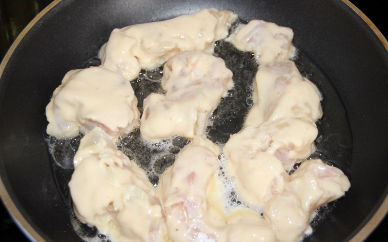 Do miski wbij jajka, roztrzep je i wymieszaj z przyprawami i szczyptą soli. Do mieszanki dodaj dwie łyżki skrobi, dokładnie połącz składniki. Rybę obtoczoną w tym cieście smaż na dużym ogniu.