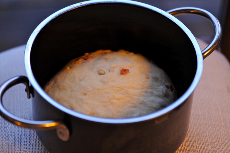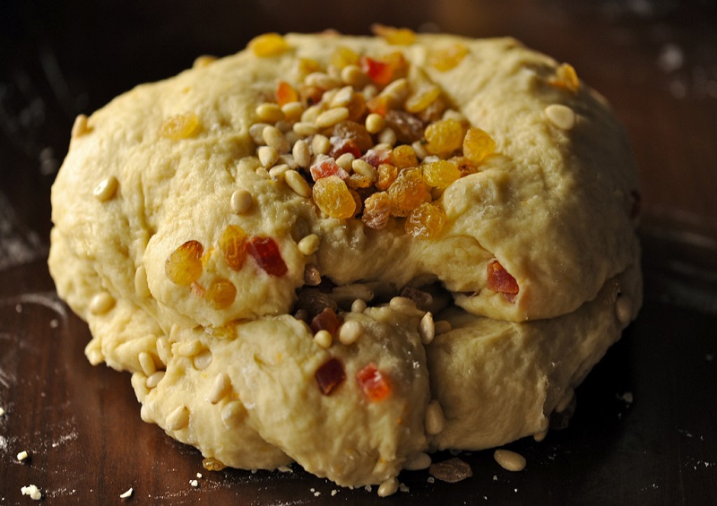 Zagniatamy ciasto. Powinno być elastyczne niczym guma do żucia. Do ciasta dodajemy rodzynki, kandyzowane owoce i orzechy. Wszystko krótko zagniatamy. Ciasto odstawiamy w ciepłe miejsce na około 1,5 godziny. Ciasto po tym czasie powinno podwoić swoją objętość.