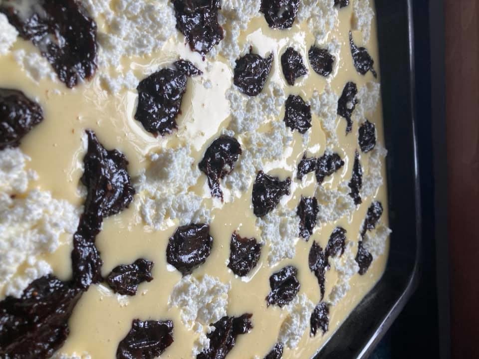 Pozostaje tylko nałożyć na sam wierzch pozostałą, drugą porcję ciasta. Blachę włożyć do piekarnika rozgrzanego do 180 stopni.