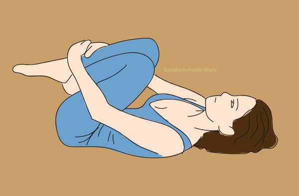 Leżąc dalej na lekcjach, ugnij kolana i połącz ze sobą kostki. Rękoma przyciągnij mocno do ciała nogi i równie mocno trzymaj kolana. W tej pozycji możesz czuć, jak rozciągają się mięśnie ud oraz dolna część kręgosłupa.