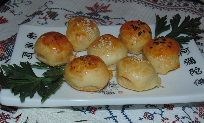 Bułeczki smarujemy roztrzepanym jajkiem i posypujemy białym lub czarnym sezamem. Pieczemy je w nagrzanym na 180 stopni piekarniku przez około 20-25 minut. Bułeczki możemy zrobić również z innym nadzieniem.