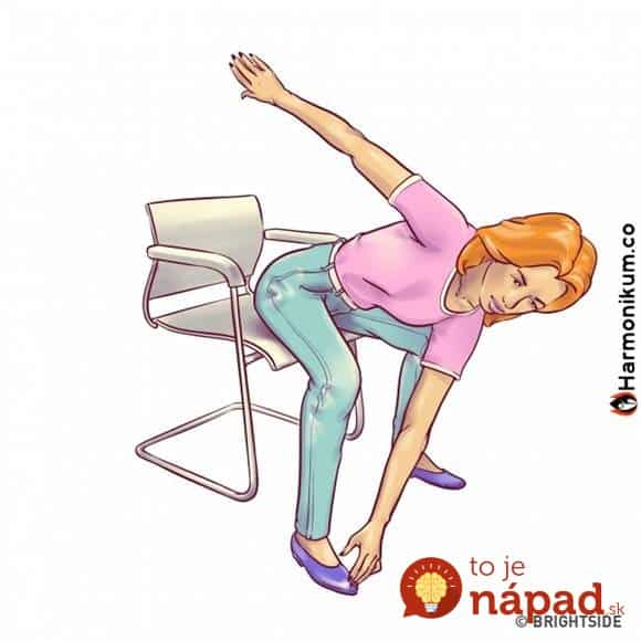 Siedząc na końcu krzesła, stopy mocno na ziemi. Pochyl się, ręce na boki, dotknij palca przeciwnej stopy. Wróć do pozycji wyjściowej i powtórz. Redukuj tłuszcz w okolicy bioder i dolnego brzucha. Wykonaj 20-30 razy.