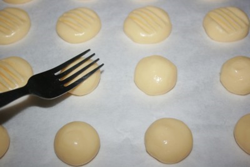 Ułóż je (w odpowiedniej odległości) na wyłożoną papierem do pieczenia blachę i dociśnij czymś, by ciasteczka były lekko spłaszczone (możesz użyć do tego widelca). Wstaw surowe jeszcze słodkości do piekarnika i piecz przez 10-15 minut.