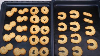 Powstałą masą napełnij rękaw cukierniczy z ozdobną końcówką i uformuj na blasze ciasteczka o różnych kształtach, np. koła czy podkowy. Ciasteczka włóż do piekarnika nagrzanego do 200°C i piecz przez 10–12 minut.