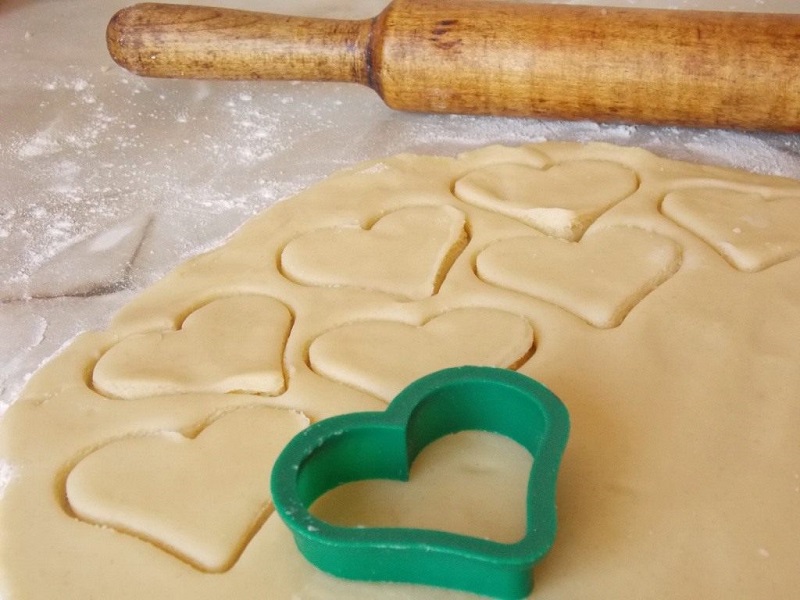 Ciasto rozwałkowujemy na podsypanym mąką blacie (nie cieniej niż na 2-3 mm). Za pomocą szklanki lub foremki wykrawamy kształty.