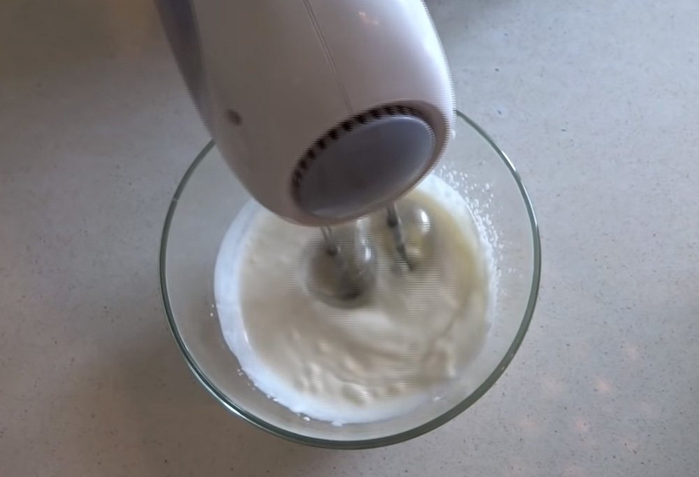 Zmniejsz obroty, gdy śmietana stanie się gęsta. Stopniowo dodawaj twarożku i mieszaj wszystko na gładką masę.