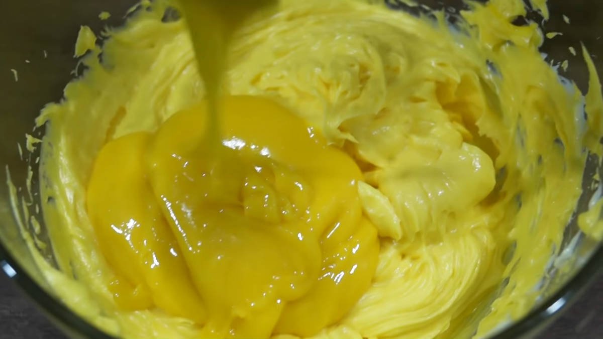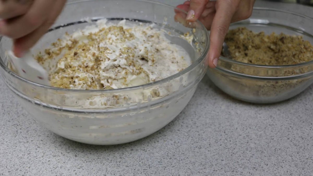 Śmietanę ubijamy na sztywno, dodajemy wcześniej zmiażdżony cukier oraz resztę zmielonych orzechów.