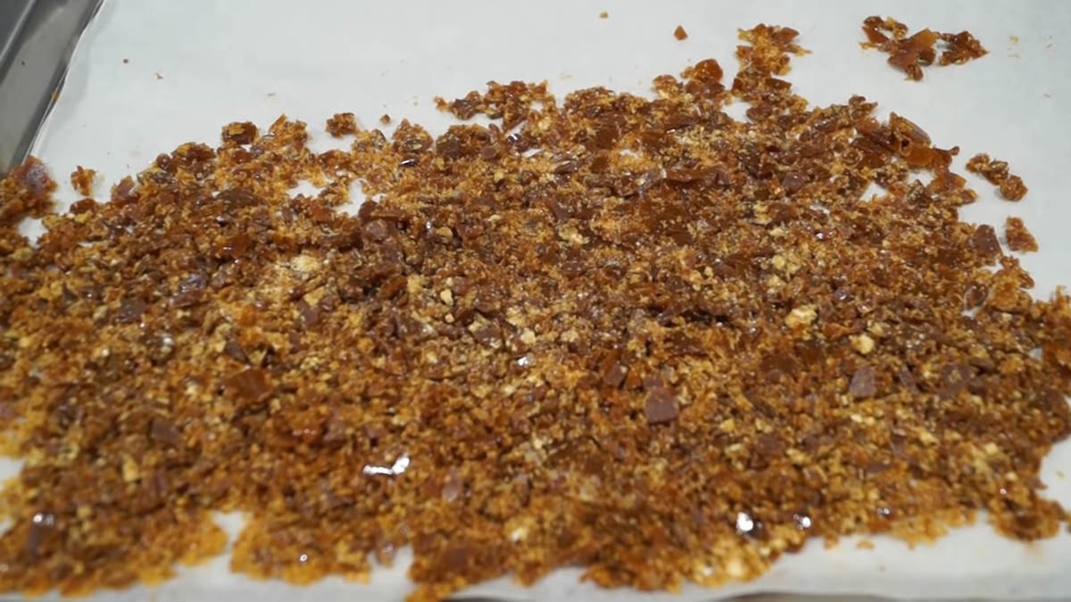 W garnuszku rozpuszczamy cukier, który nam został i go karmelizujemy. Powstałą masę wylewamy na blachę pokrytą pergaminem i przykrywamy drugą kartką pergaminu. Po zastygnięciu miażdży cukier na małe kawałki.