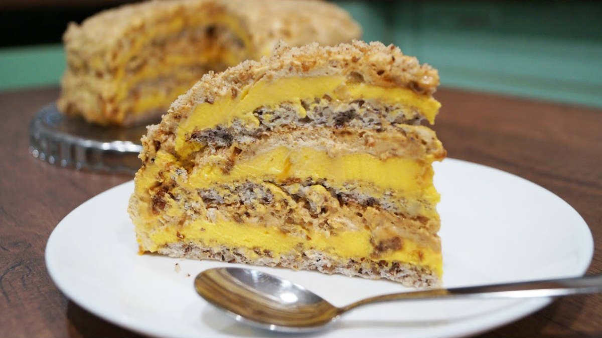 Ciasto dzielimy na trzy części. Na każdą część wykładamy 1/3 kremu budyniowego oraz karmelu z orzechami. Wierzch ciasta dekorujemy orzechami.