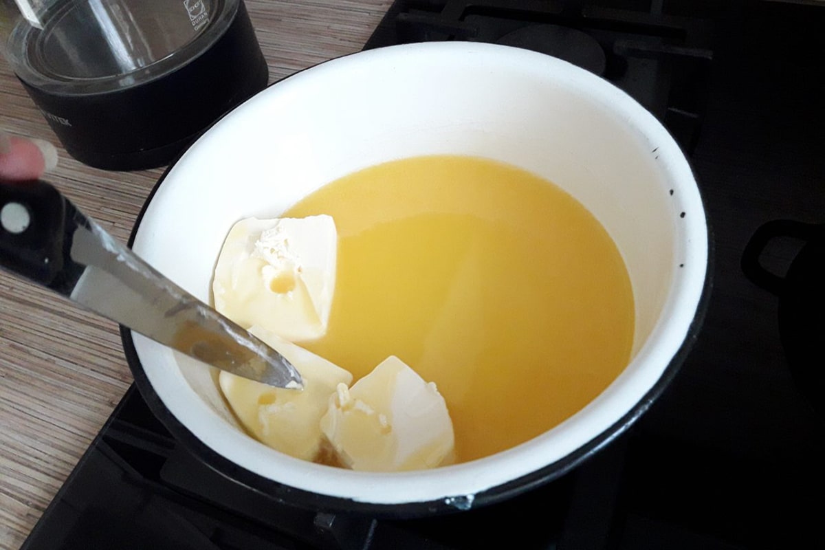 Drożdże rozmieszać w ciepłym mleku z łyżką mąki i cukru. Odstawić w ciepłe miejsce, aby podwoiły swoją objętość. Masło lub margarynę roztopić i wystudzić.