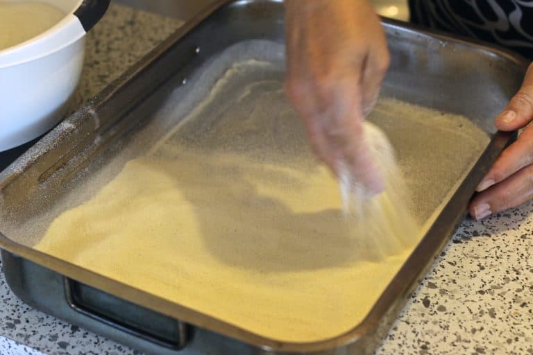 Blachę do pieczenia należy nasmarować masłem i obsypać mąką. Na jej dno wykładamy część przygotowanej mieszanki sypkiej, tworząc warstwę nie za grubą, ale wystarczająco solidną, aby nie prześwitywało przez nią dno.
