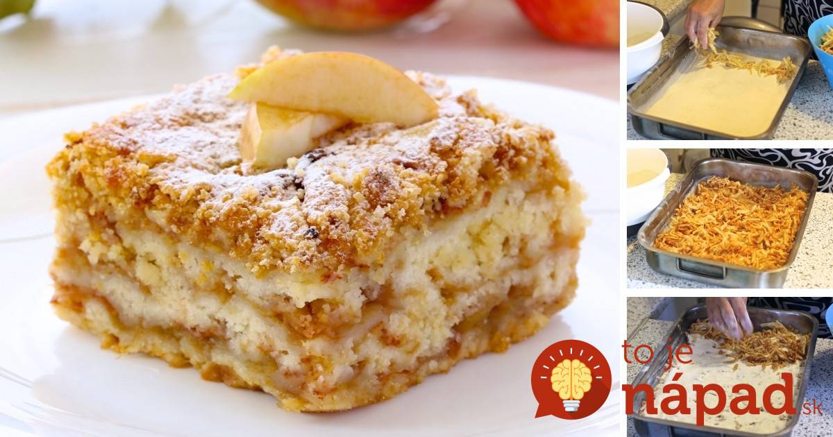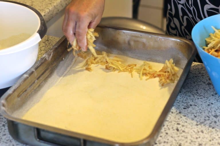 Następnie na suchej warstwie rozmieszczamy starte jabłka, zalewając je sokiem, ale nie rozgniatając owoców. Kolejny etap to ponowne nałożenie suchej mieszanki na jabłka, a potem znowu jabłka. Kończymy posypaniem resztki suchej mieszanki i zetrzeniem na wierzch masła lub margaryny.