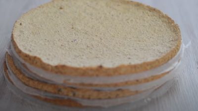 Przejedź nożem po krawędziach upieczonego korpusu i usuń brzeg ciasta. Następnie zdejmij również korpus z dolnej części krawędzi ciasta. Uwaga: Powtarzaj ten proces, aż będziesz mieć 4 identyczne korpusy.