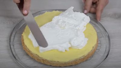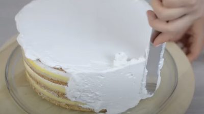 Włóż ciasto do lodówki i pozwól mu ostygnąć. Do dekoracji ubić śmietanę i posmarować nią całe wystudzone ciasto, łącznie z bokami. Wskazówka: Deser smakuje wyśmienicie, jeśli zostawimy go w lodówce na noc.
