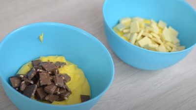 Ponownie postaw na ogień i za pomocą miksera wszystko ubijaj tak, aby składniki jak najdokładniej się połączyły. Podgrzewaj mieszaninę przez około 4 minuty, aż zgęstnieje. Krem rozdzielić równomiernie do dwóch misek – w jednej części wymieszać gorzką czekoladę, a w drugiej białą. Następnie przykryj kremy folią spożywczą i pozostaw do ostygnięcia.