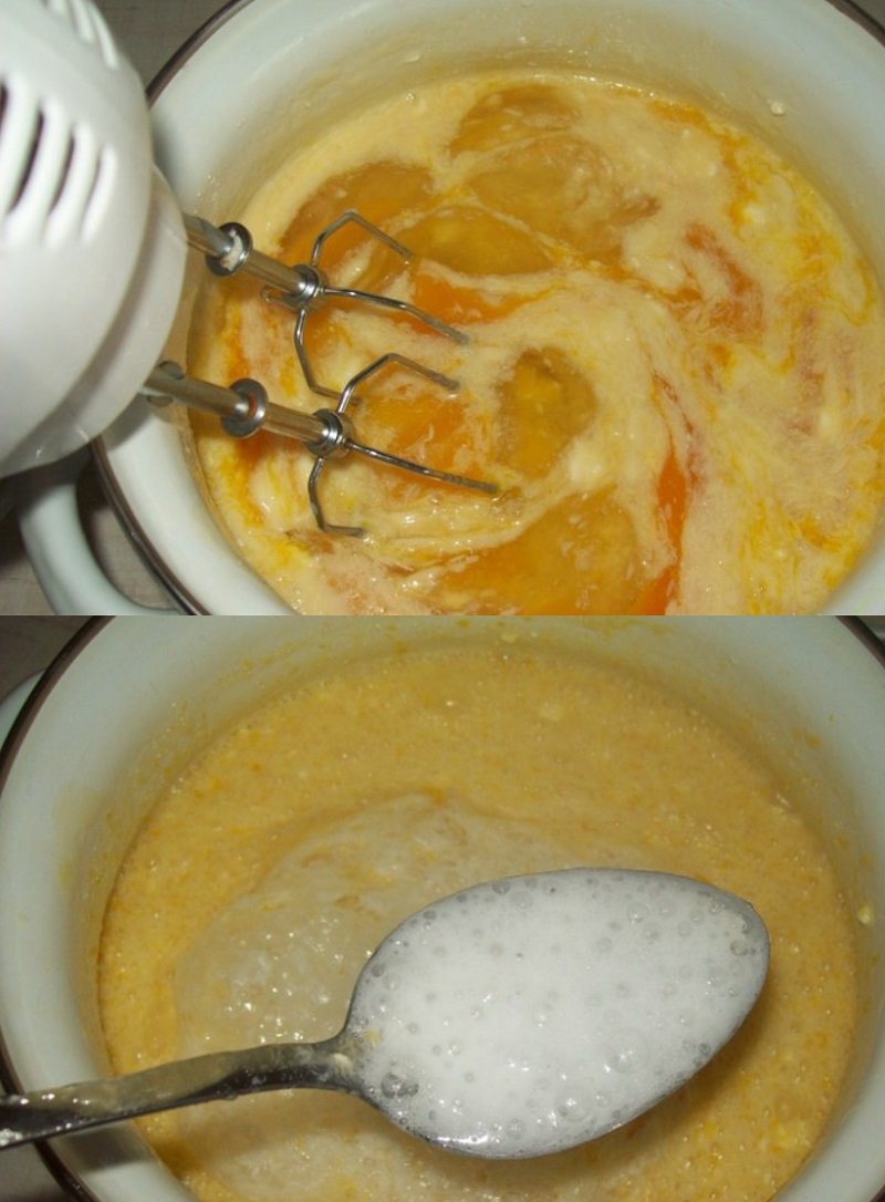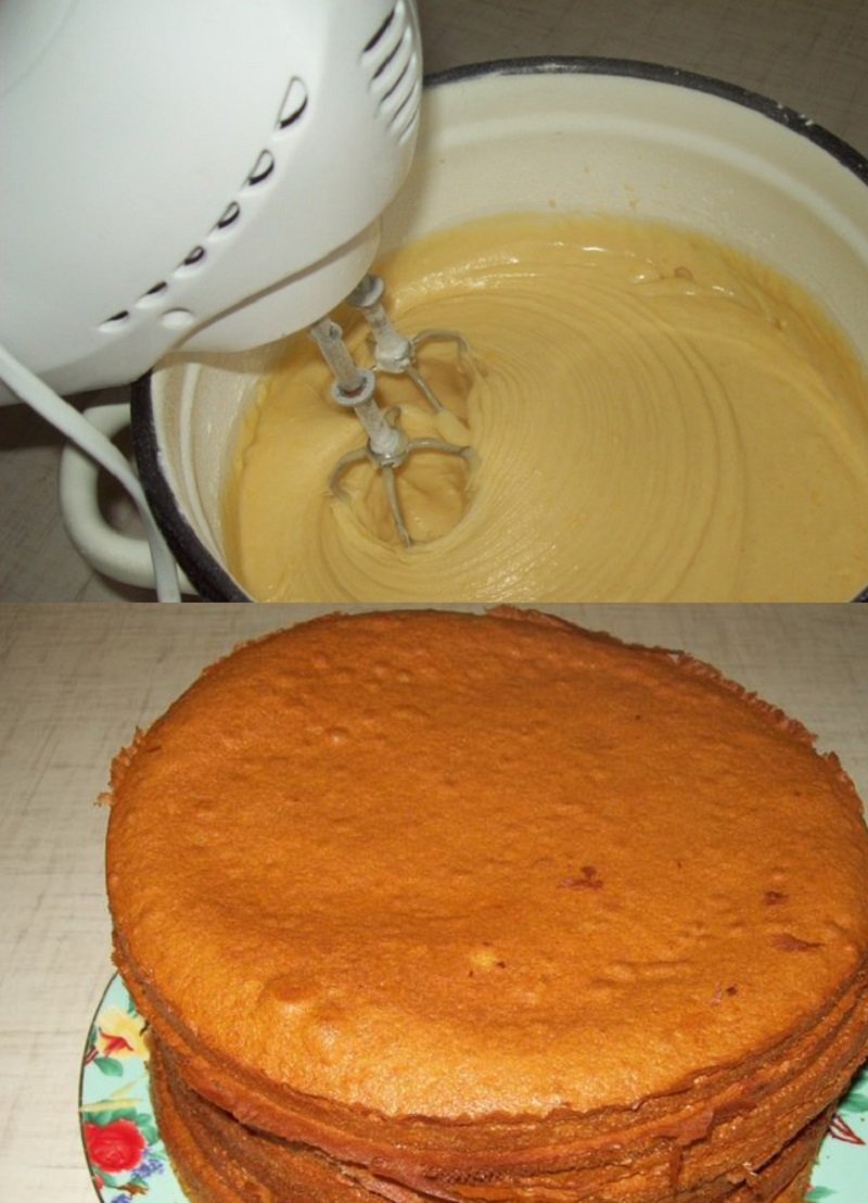 Do masy dodaj jajka, sodę i ocet i ponownie dokładnie wymieszaj, możesz to zrobić mikserem. Następnie dodawaj powoli mąkę, cały czas mieszając, aż do uzyskania gładkiego ciasta. Na pergaminie położonym na blaszce, używając 1/8 ciasta, ułóż za pomocą łyżki płaski placek. Piecz ciasto przez 12 minut w nagrzanym piekarniku i następnie powtórz cały proces z pozostałym ciastem.