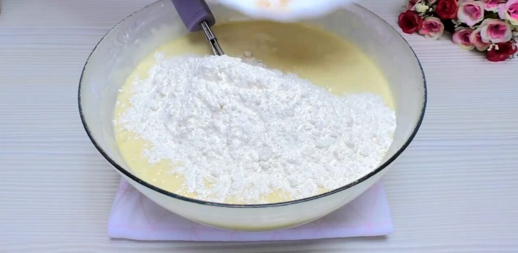 W dużej misce umieść jajka, szczyptę soli i cukier. Miksuj ręcznym mikserem do uzyskania jednolitej masy. Do mąki dodaj proszek do pieczenia, a następnie stopniowo, w dwóch partiach, dodawaj mąkę do masy jajecznej, mieszając trzepaczką.