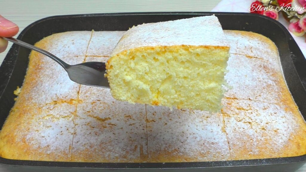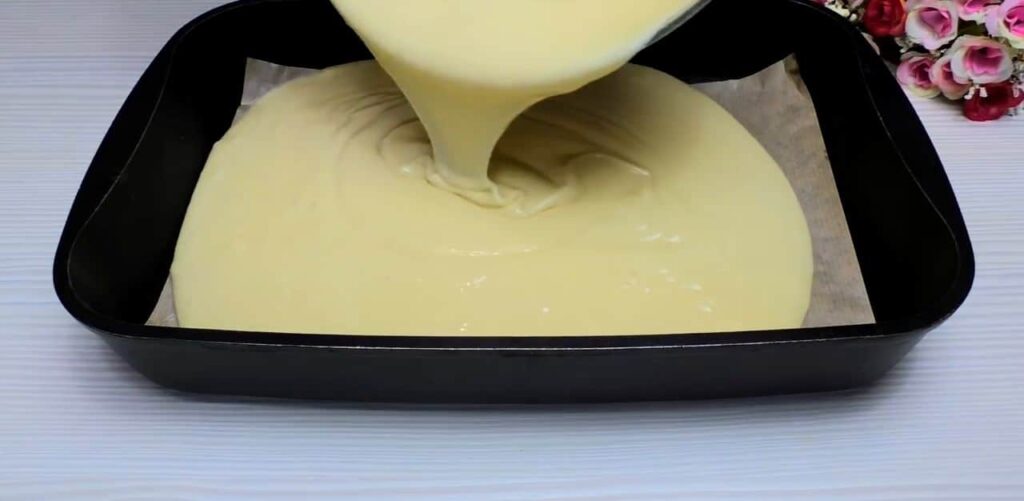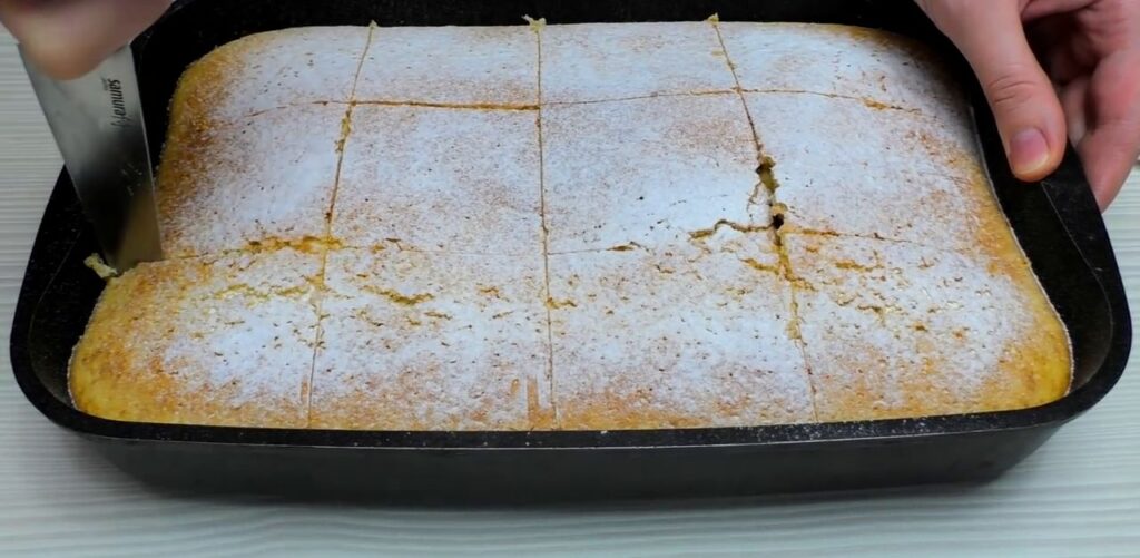 W rondelku podgrzewaj mleko z masłem i cukrem waniliowym, aż masło się rozpuści. W dwóch etapach dodawaj mieszankę mleka i masła do masy jajecznej, za każdym razem dokładnie mieszając. Przygotuj formę do pieczenia, wykładając ją papierem do pieczenia, a następnie wlej do niej ciasto. Posyp ciasto cukrem pudrem.