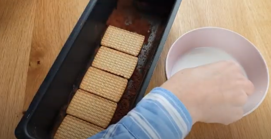 Na dnie prostokątnej formy (około 20×30 cm) ułóż warstwę namoczonych ciasteczek. Na ciasteczka nałóż warstwę kremu, równomiernie rozprowadzając. Powtarzaj układanie warstw ciasteczek i kremu, aż do wyczerpania składników, kończąc warstwą kremu. Posyp wierzchnią warstwę kremu kakao w proszku.