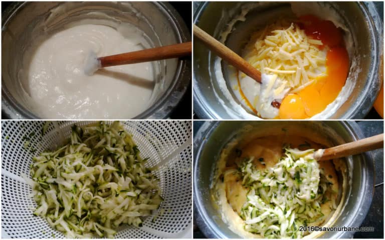 W taki sposób powstanie biały sos, który gotujemy przez 3 bądź 4 minuty na bardzo małym ogniu. Gdy sos będzie gotowy odstawiamy go na bok, gdyż sos musi ostygnąć przez około 10-15 minut. Cukinię należy umyć i zatrzeć na tarce, a następnie odstawić na sitko aby odsączyć się z niej nadmiaru wilgoci.