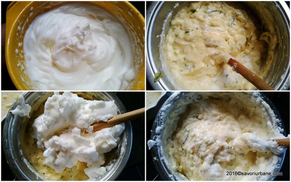 Piekarnik nagrzewamy do 200 stopni Celsjusza, a do przygotowanego wcześniej sosu należy dodać 4 żółtka i 60 g startego sera. Cukinię dodatkowo należy odcisnąć w dłoniach i dodać do mieszanki. Wówczas należy obsypać całość pieprzem i dokładnie wymieszać. Następnie należy ubić białka ze szczyptą soli na sztywną pianę.