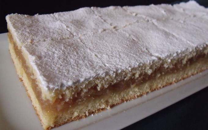 Przygotuj blachę o wymiarach 24×36 cm. Na spód wyłóż pierwszą warstwę ciasta, a następnie przykryj przygotowanym wcześniej nadzieniem z jabłek. Na wierzch połóż druga warstwę ciasta. Nakłuj ciasto widelcem i włóż je do uprzednio rozgrzanego piekarnika. Piecz całość przez około 45 minut w temperaturze 200 stopni.
