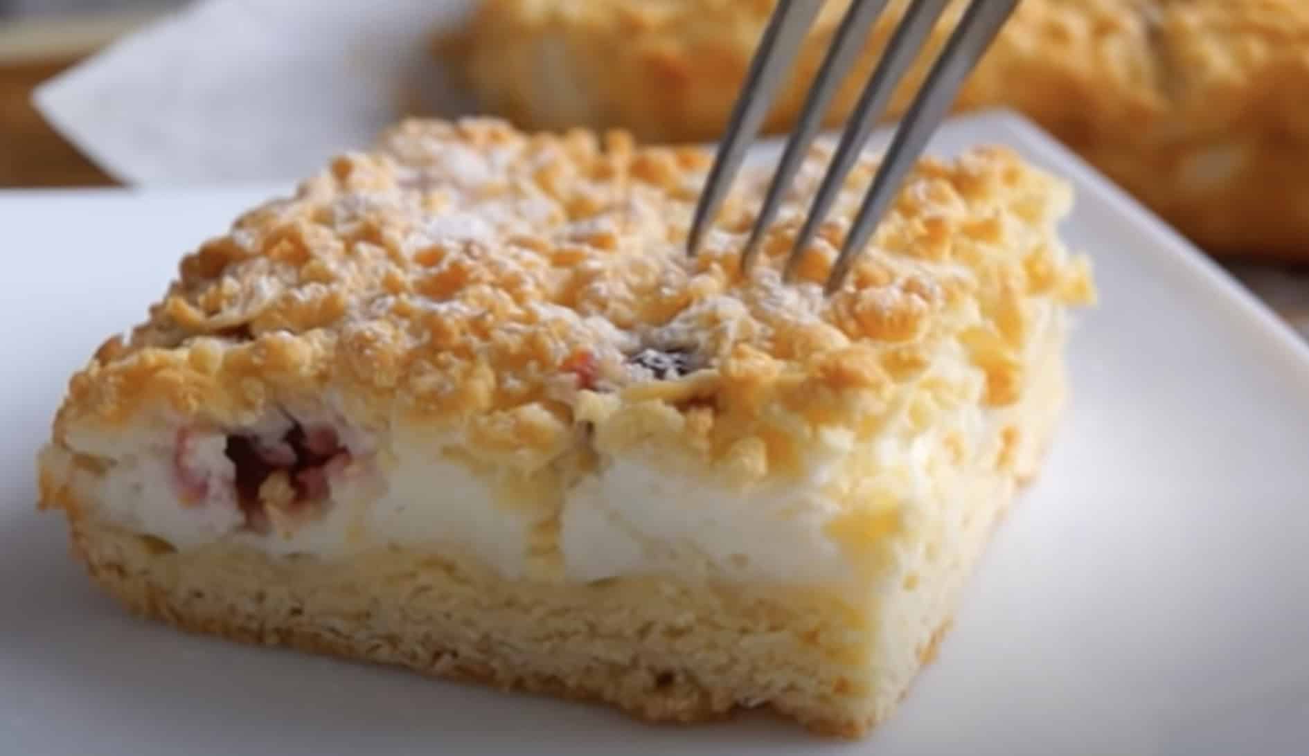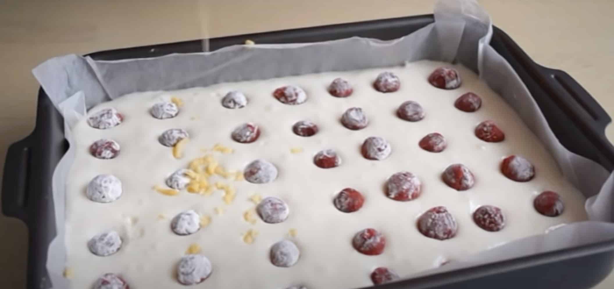 Dodaj cukier waniliowy, śmietanę i skrobię. Delikatnie wymieszaj drewnianą łyżką, aż masa będzie gładka. Posyp wiśnie skrobią i wymieszaj. Dno formy (30*32 cm) wyłóż papierem do pieczenia. Większą część ciasta równomiernie wykładamy na spód, wygładzamy. Na ciasto wylewamy farsz, układamy wiśnie.