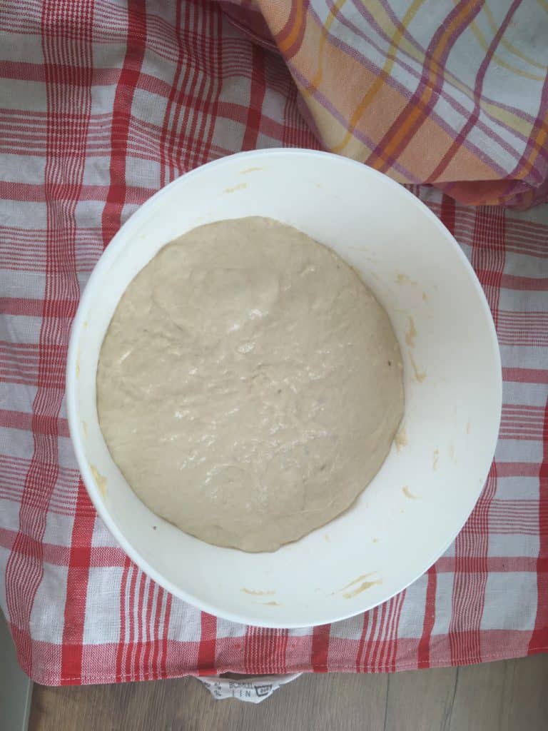 Przygotuj miskę i wymieszaj całą resztę składników na ciasto z rozczynem tj;