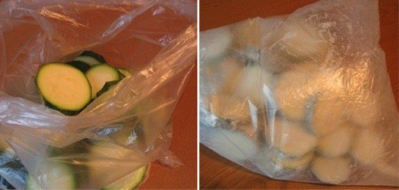 Do tej samej reklamówki wrzuć pokrojoną cukinię i zakręć woreczek tak, by było w nim trochę powietrza. Wstrząśnij torebką, by dokładnie wymieszać wszystkie składniki.