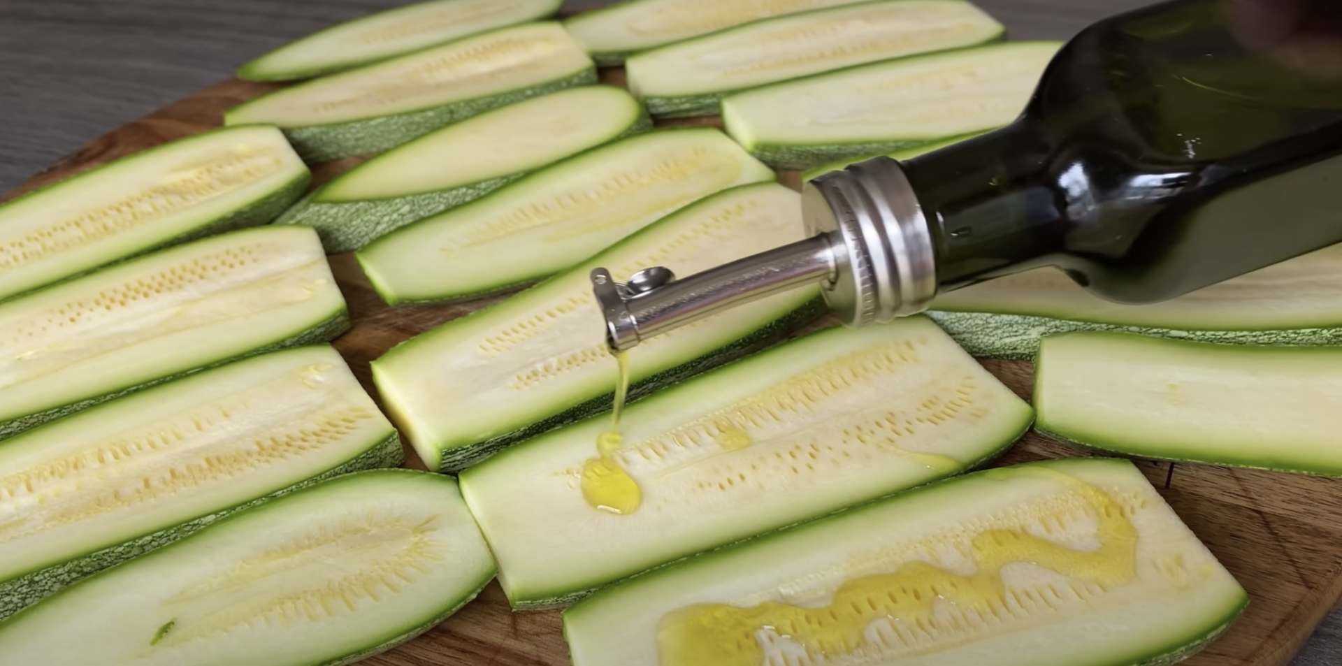 Powierzchnia cukinii musi zostać natarta oliwą z oliwek, z dwóch stron.