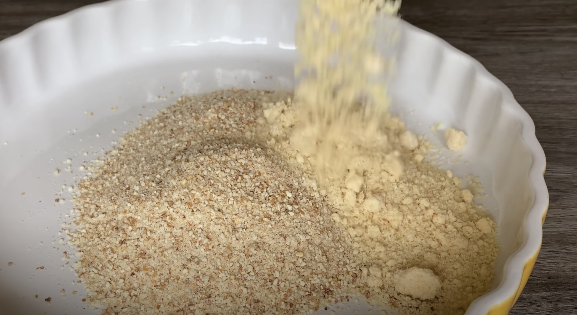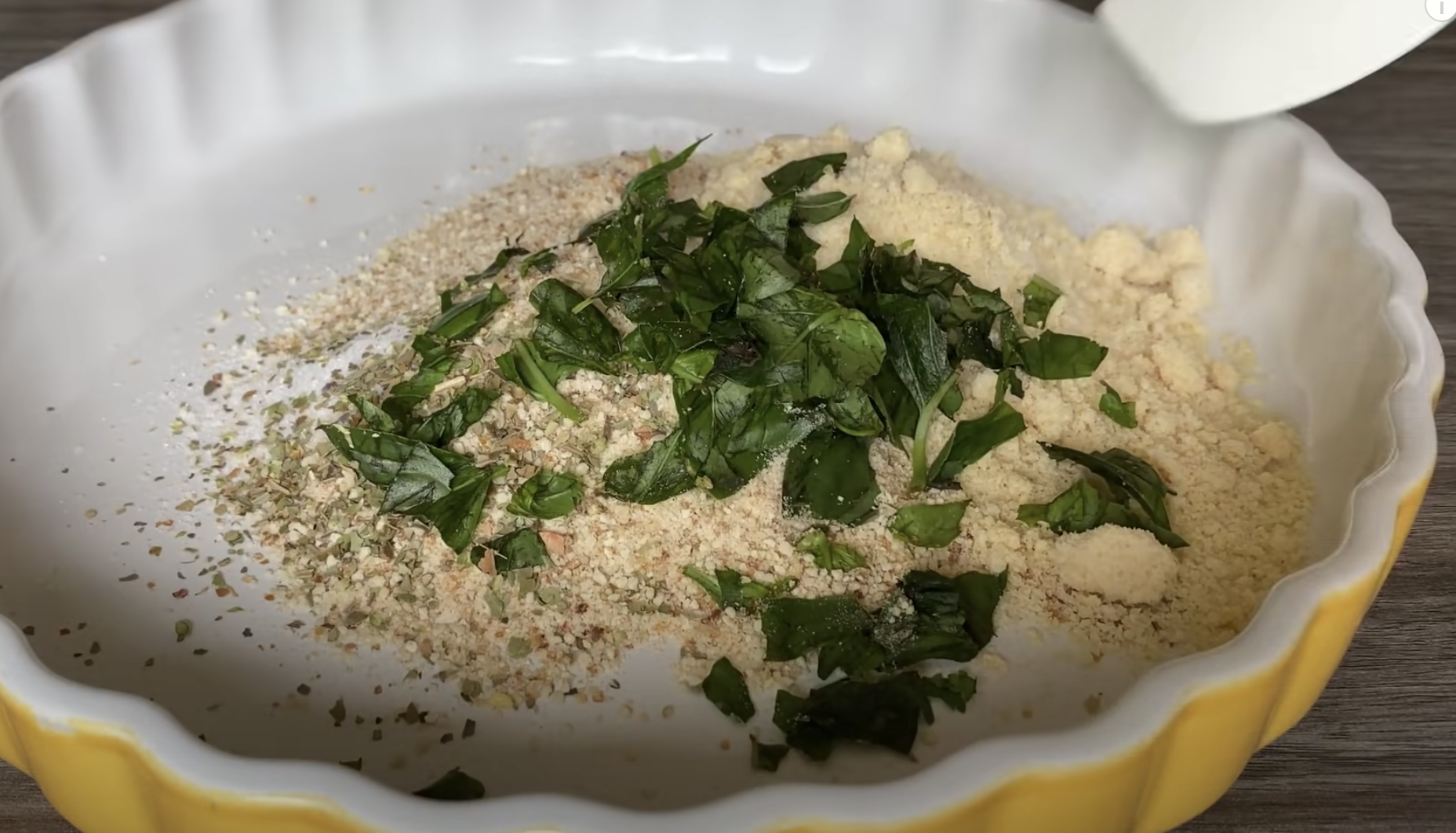 Bułkę tartą należy wymieszać z parmezanem, a także ziołami oraz przeciśniętym czosnkiem.
