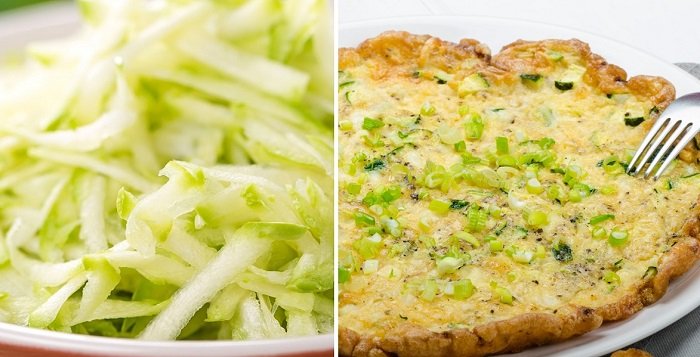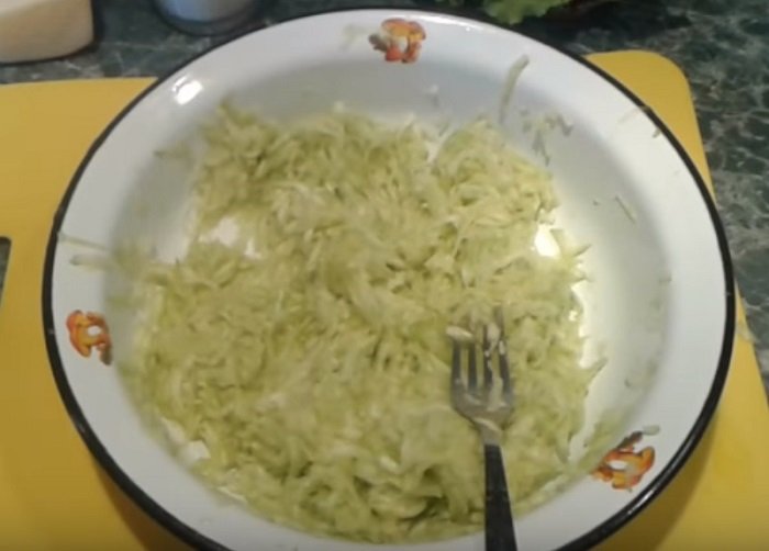 Następnie należy przygotować cukinię (około 400 gram) – obrać ze skóry, umyć i zetrzeć na grubych oczkach tarki. Po starciu całości konieczne jest jej odciśnięcie.