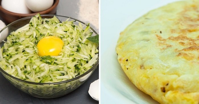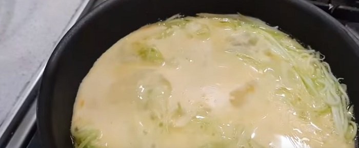Podsmażoną mieszankę cukinii i cebuli należy wlać do mieszanki cukinii i jajka, przyprawić, a następnie wlać ponownie na patelnię z olejem.
