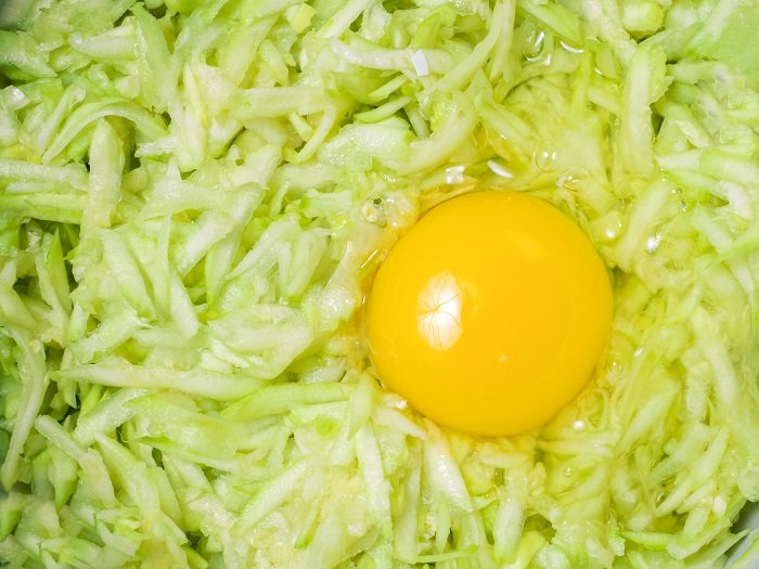 Połowę tego, co udało nam się zetrzeć na tarce, należy dorzucić do smażącej się cebuli, by razem grzały się przez około 4 minuty. W międzyczasie drugą połowę naszego głównego składnika należy ubić w misce z 4 jajkami.