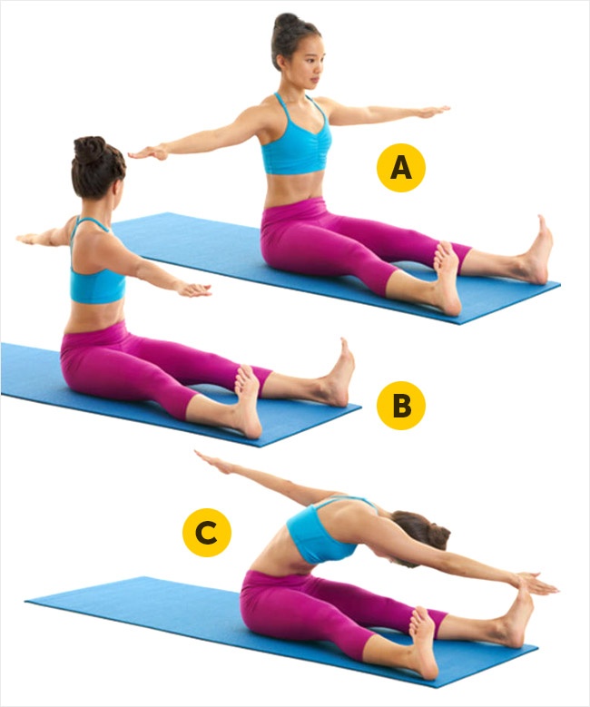 Nie zapominajmy o rozciąganiu: siedząc na macie z prostymi nogami, wykonujemy obrót ramion o 90 stopni, a następnie dotykamy przeciwną stopę. Wykonujemy to ćwiczenie 30 razy na każdą stronę. Rozciąganie należy zakończyć prostując plecy.