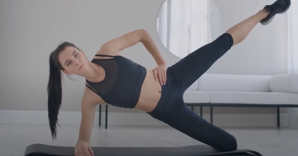 W pozycji bocznej oprzyj się na łokciu oraz kolanie u jednej nogi, a później unieś drugą, wyciągniętą nogę na tyle wysoko, jak to możliwe, a drugą rękę połóż w miejscu talii. Powtarzaj z każdej strony przez 30 sekund.