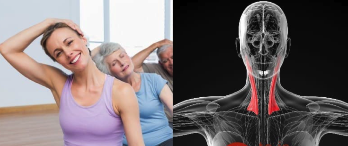 Utrzymaj tą pozycję przez 30 sekund, możesz wspomóc sobie ręką, podtrzymując nią głowę. Ćwiczenie należy powtarzać w obu kierunkach (głowa do prawego ramienia, a potem głowa do lewego ramienia).