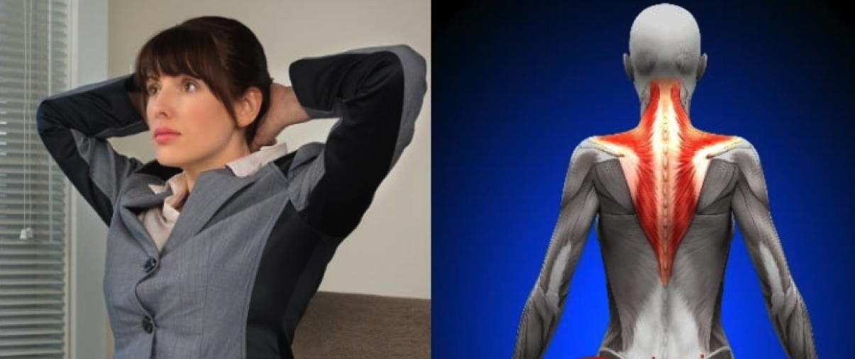 Drugie ćwiczenie wspomagające mięśnie szyi ma wyglądać następująco (można na siedząco): zegnij łokcie i załóż je za głowę, tak, aby dłonie dotykały miejsca tuż nad Twoją szyją.