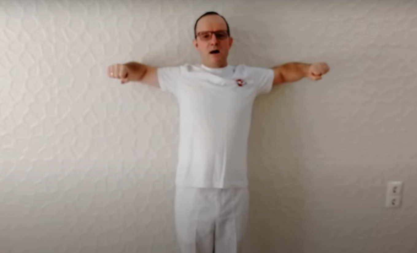 Aby wykonać ćwiczenie pierwsze należy stanąć pod ścianę tyłem odsunąć się od niej o jeden mały krok. Następnie należy oprzeć ramiona i łopatki o ścianę. Nasze ręce powinny być ustawione pod odpowiednim kątem, aby wszędzie był kąt prosty. Podczas wydechu należy wypchnąć łokcie w ścianę, a na wdechu rozluźnić.