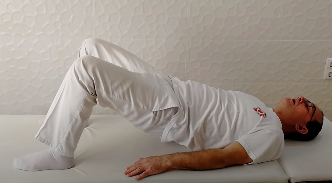 To ćwiczenie należy wykonać na przykład na kanapie lub podłodze. W celu wykonania ćwiczenia należy położyć się na plecach, ugiąć nogi w kolanach, a ręce położyć blisko miednicy. Wówczas podczas wykonywania wydechu należy starać się maksymalnie unieść miednicę.