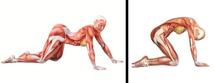 Grzbiet kota doskonale przygotowuje kręgosłup, kark i ramiona. Rozpocznij na czworakach. Zginając plecy, opuść się powoli na brzuch i unieś głowę. Zatrzymaj na kilka sekund. Następnie łukowato wygień kręgosłup do góry, naśladując kota. Ćwicz 10 razy.