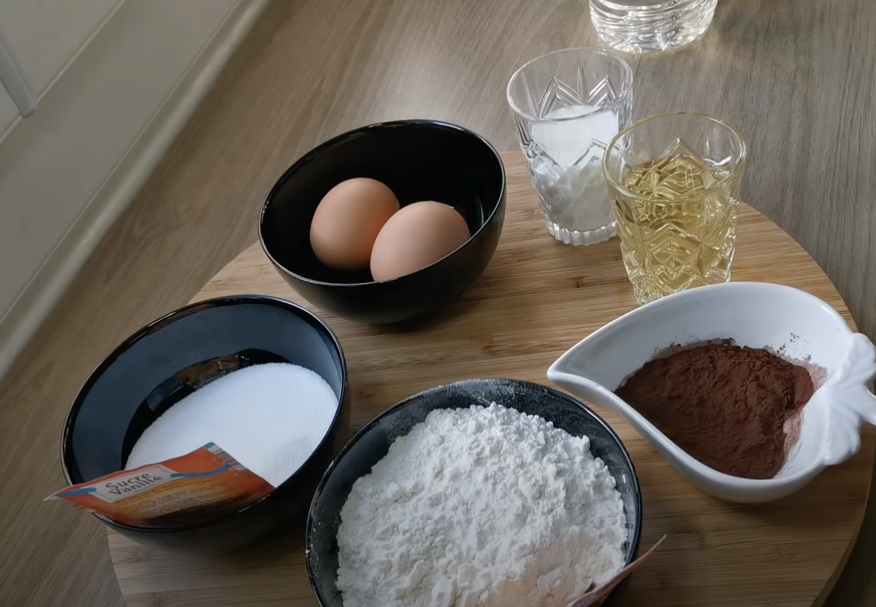 Rozpocznij od ubicia jajek. Dodaj do nich olej i mleko, a następnie wymieszaj. Na końcu dodaj pozostałe składniki ciasta i wymieszaj. Przelej ciasto do formy wyłożonej papierem do pieczenia. Pieczenie: 180 stopni Celsjusza, około 15 minut.