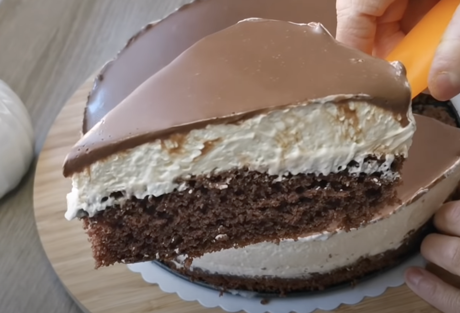 Połącz kakao z gorącym mlekiem i polej nim biszkopt po wyjęciu z piekarnika. Następnie pozostaw do ostygnięcia. Ubij śmietanę z mascarpone, cukrem waniliowym i zwykłym cukrem. Po nałożeniu kremu na biszkopt, chłodź przez 10 minut.