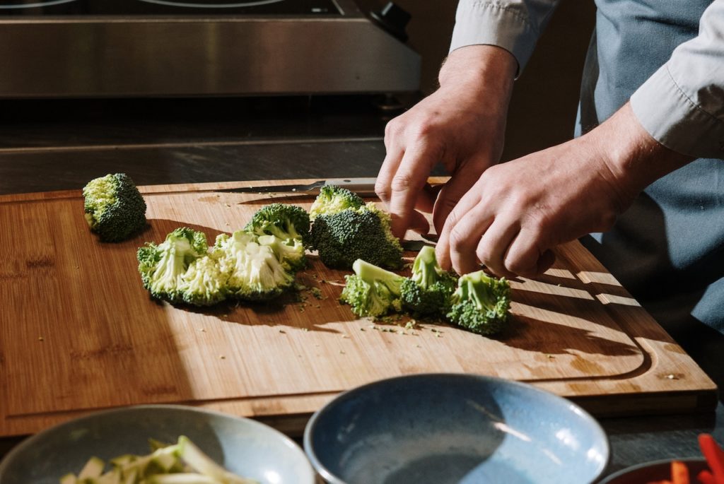 Mieszaj i smaż przez dwie minuty. Brokuły dzielisz na pół różyczki i wprowadzasz na patelnię. Mieszasz i smażysz przez 4 minuty.