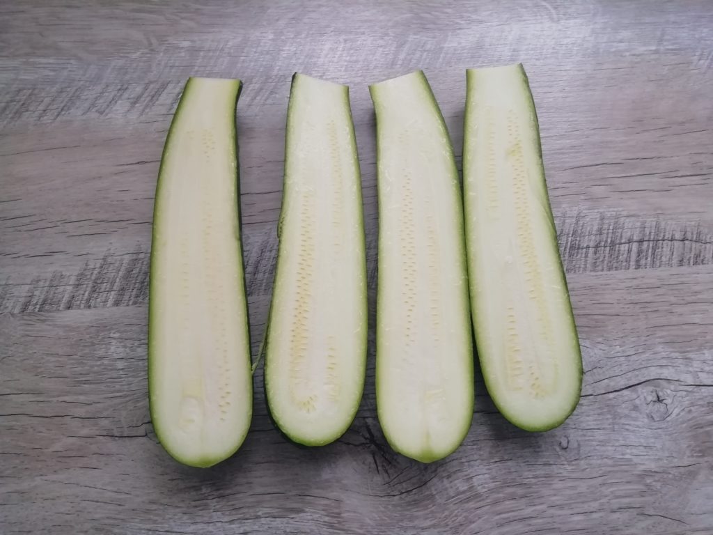 Cukinie poddaj obróbce – odetnij końce, pokrój w kostkę i dołącz do reszty warzyw.