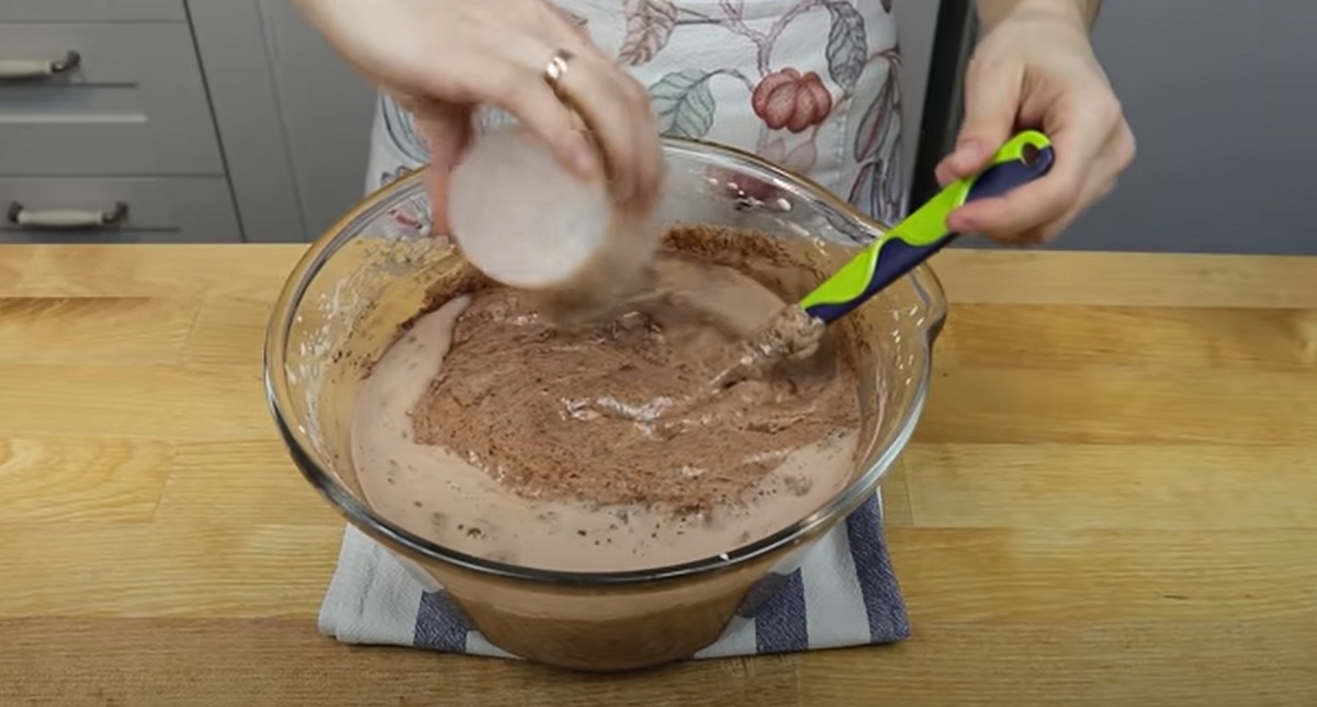 Do osobnej miski przez sito przesypujemy mąkę, proszek do pieczenia i kakao. Następnie dodajemy mieszankę do ubitych jajek, etapami, po łyżce. Lekko przy tym mieszamy jajka od dołu go góry.