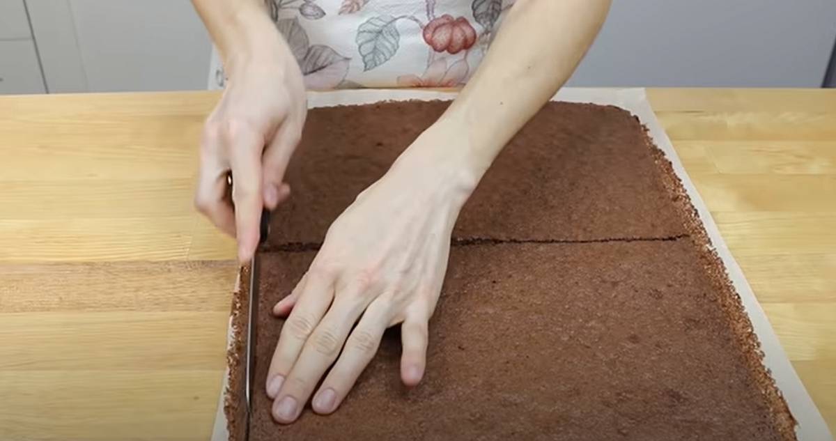 Gdy biszkopt będzie już upieczony (warto sprawdzić wykałaczką, czy jest gotowy) pozostawiamy go do wystygnięcia. Gdy jest już zupełnie zimny – przecinamy go na pół i, w razie potrzeby, wyrównujemy krawędzie.