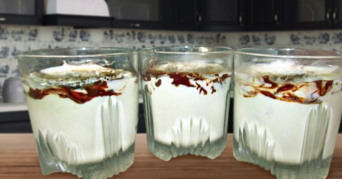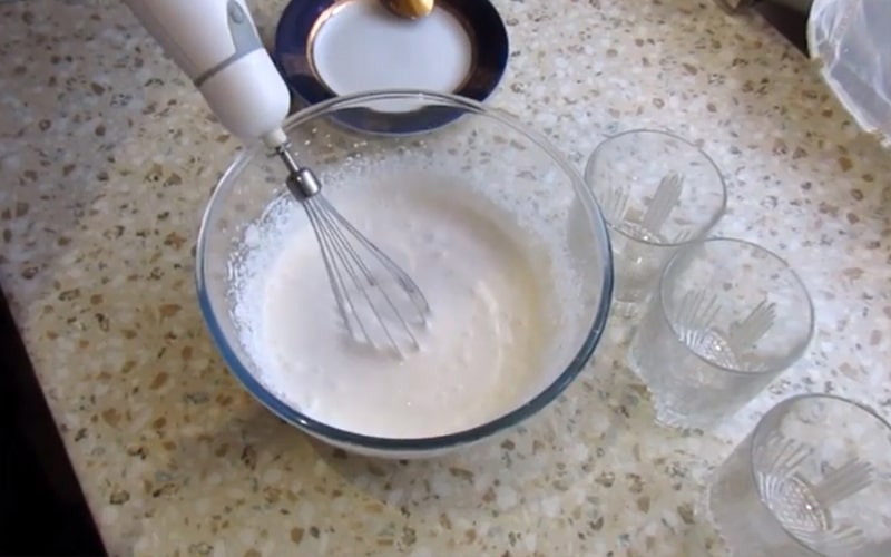 Wymieszaj 350 g śmietany z cukrem i agarem. Ubij masę mikserem, aż składniki całkowicie się rozpuszczą. Następnie wlej mieszaninę do 2/3 pucharków deserowych/szklanek i wstaw do lodówki na 20 minut.