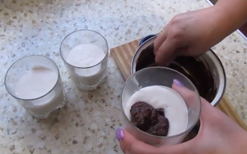W tym czasie połamaną czekoladę wymieszaj z 50 g śmietany i umieść w kąpieli wodnej. Gotuj na małym ogniu do momentu, aż masa będzie gładka. Wlej czekoladę do miseczek, delikatnie wymieszaj czekoladę z wierzchnią warstwą śmietany. Deser posyp wiórkami kokosowymi.